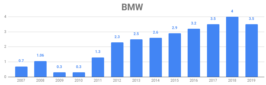 Cuando hablamos de BMW, hablamos de una empresa cíclica. Aún así, desde 2011 su dividendo ha sido creciente hasta este año que lo ha recortado. Comprar este tipo de empresas en la parte baja del ciclo suele dar rendimientos a largo plazo.