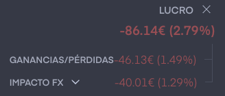De esos -86,14€, -46,13€ corresponden a la propia operación con las acciones y el -40,01€, lo que se denomina IMPACTO FX, se están perdiendo por el cambio entre divisas.
