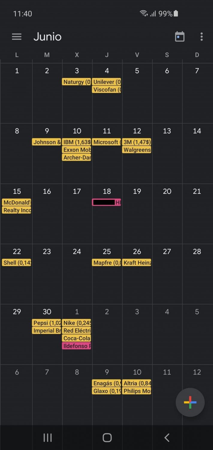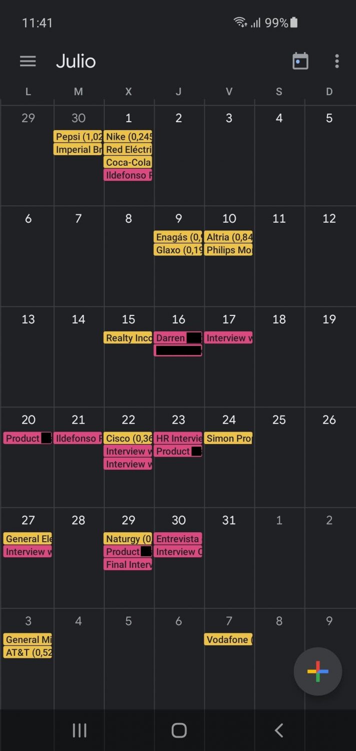 Este es mi calendario de los meses de Mayo, Junio y Julio. Lo amarillo son los dividendos a cobrar (sincronizados con el divippcalendario). Lo rosa son entrevistas: telefónicas, skype, zoom, Google Meet…