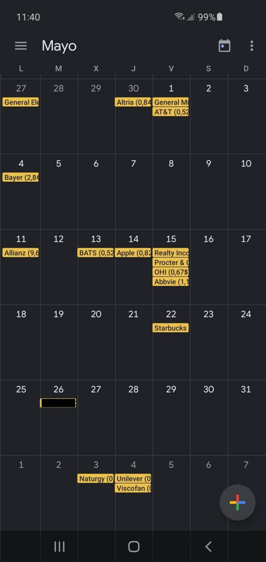 Este es mi calendario de los meses de Mayo, Junio y Julio. Lo amarillo son los dividendos a cobrar (sincronizados con el divippcalendario). Lo rosa son entrevistas: telefónicas, skype, zoom, Google Meet…